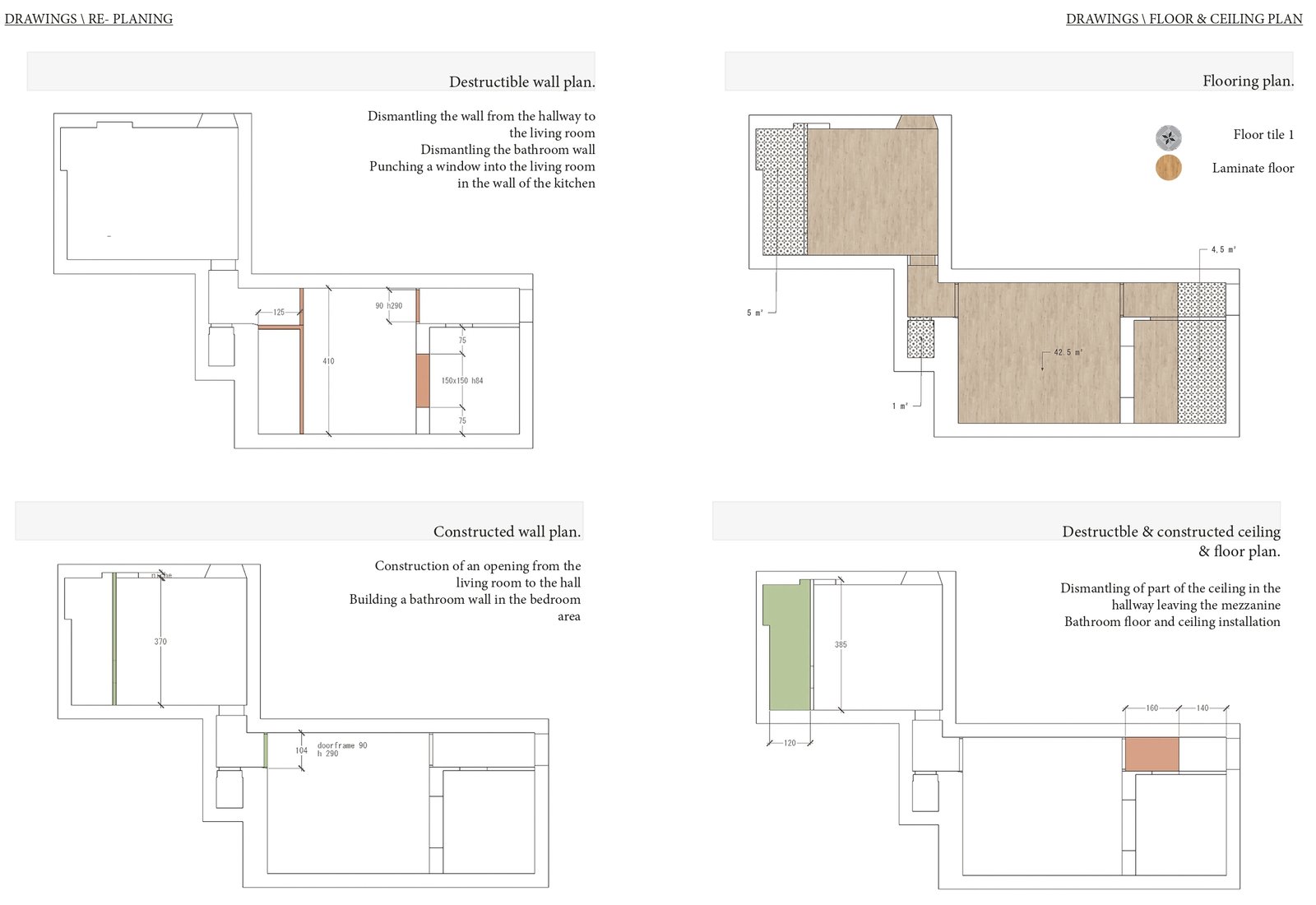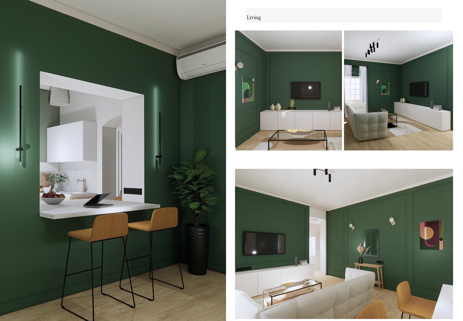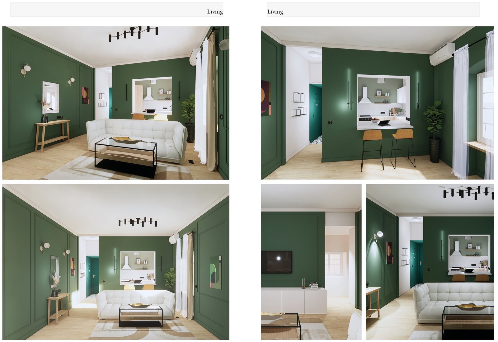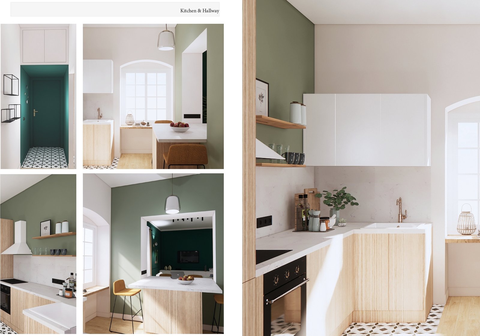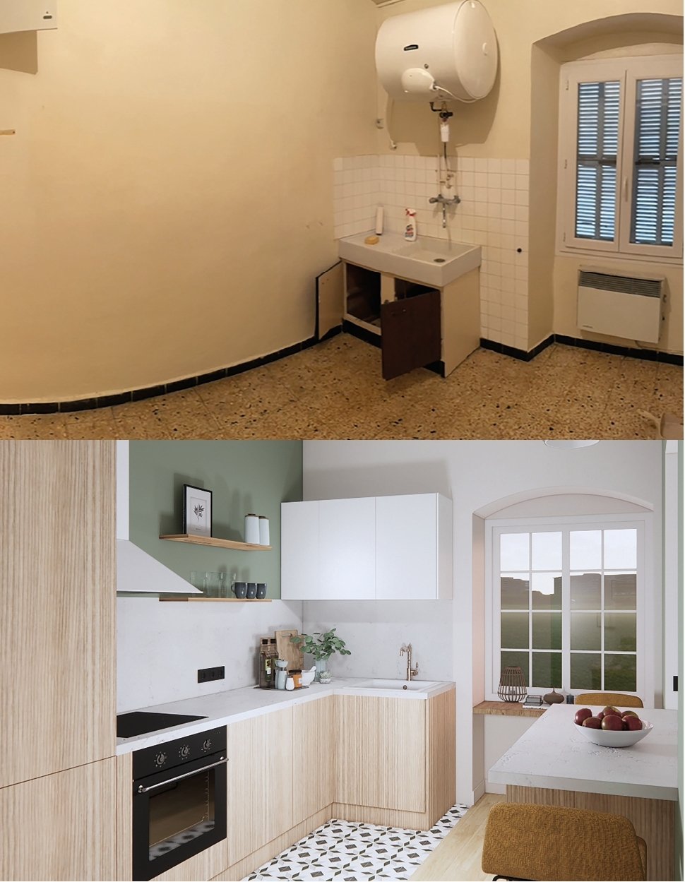 - Cuisine repensée : ajout d’un comptoir multifonction entre la cuisine et le salon, servant à la fois d’espace de repas et de bureau.